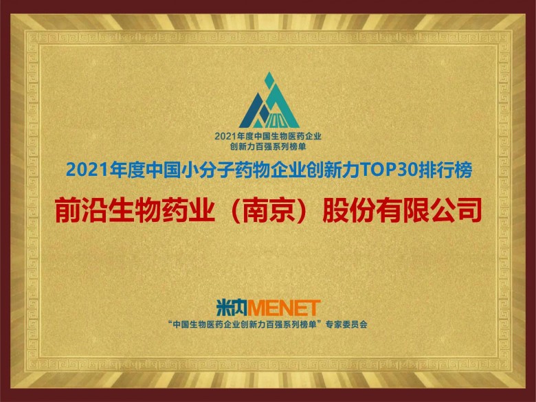 9月16日,由米內(nèi)網(wǎng)主辦的“惟創(chuàng)新者行穩(wěn)致遠(yuǎn)——2021年度中國(guó)生物醫(yī)藥企業(yè)創(chuàng)新力百?gòu)?qiáng)系列榜單發(fā)布會(huì)”隆重舉行并揭曉系列榜單,評(píng)選榜單以科技部《企業(yè)創(chuàng)新能力評(píng)價(jià)指標(biāo)體系》為理論依據(jù),結(jié)合創(chuàng)新投入、創(chuàng)新成果等指標(biāo)維度,及權(quán)威公開(kāi)數(shù)據(jù)統(tǒng)計(jì),遴選出中國(guó)具有醫(yī)藥創(chuàng)新實(shí)力的100家企業(yè)。前沿生物(股票代碼:688221.SH)作為國(guó)內(nèi)創(chuàng)新藥領(lǐng)軍企業(yè),再次成功入選細(xì)分榜單——中國(guó)小分子藥物企業(yè)創(chuàng)新力 TOP30,并受邀出席本次大會(huì)。